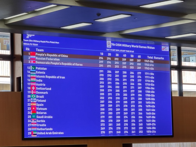 10月19日上午,在武汉举行的第七届世界军人运动会男子25米手枪军事速射团体项目中,由谢振翔、金泳德和姚兆楠组成的中国队以1747环夺得冠军,成功卫冕。这也是中国代表团在本届军运会上夺得的首枚金牌。