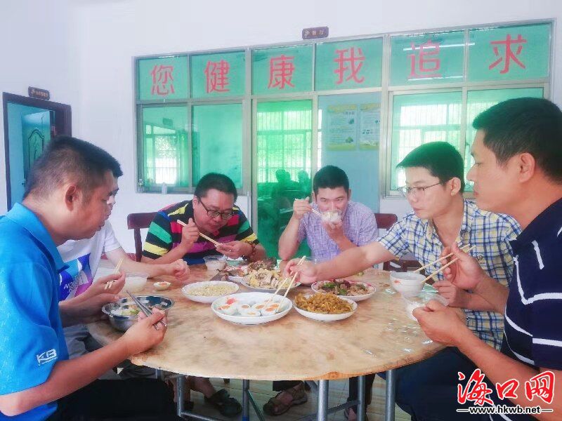 22日中午,正值午饭时间。海口网(微信号:haikouwang2013)记者在金堆村脱贫攻坚中队看到,青菜、咸鸭蛋、白切鸡、青椒……看似简单的农家菜,金堆村的帮扶责任人吃得十分开心。“这些菜大部分是贫困户家里的农产品,我们自掏腰包买下来做午餐,填饱了肚子,又为扶贫出了力。”唐其良介绍。