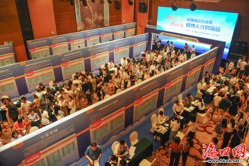 海口网11月9日消息(见习记者王程龙 摄影报道)11月9日上午,海南省2019年硕博人才对接会在海口举办,本次对接会以“开放海南 共享未来”为主题,搭建用人单位与硕博人才的精准对接平台,吸引众多高层次人才参与。