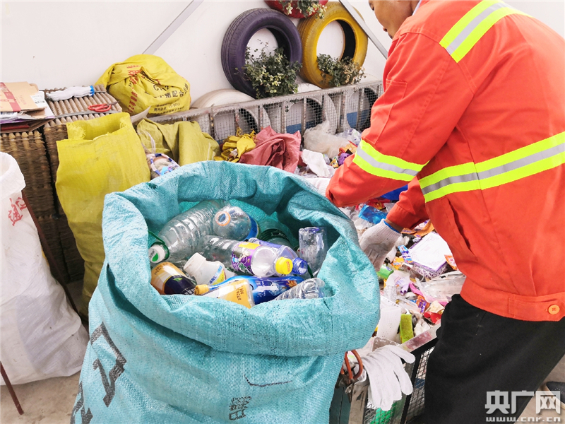 分拣员将拣出的饮料瓶收纳入袋(央广网记者 陈锐海 摄)