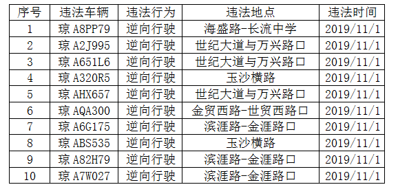 海口网11月17日消息(记者傅巍)17日,海口网(微信号:haikouwang2013)记者从海口公安交警支队获悉,车牌号为琼A8PP79等10辆小汽车近期因存在逆向行驶违法行为,根据《海南省道路交通安全法》第90条、《海南省实施<道路交通安全法>办法》第64条第一款第20项的规定,交警部门将对以上车辆处以罚款200元记3分的处罚。
