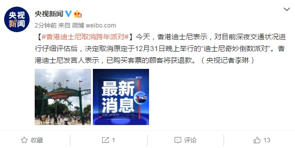 今天,香港迪士尼表示,对目前深夜交通状况进行仔细评估后,决定取消原定于12月31日晚上举行的“迪士尼奇妙倒数派对”。香港迪士尼发言人表示,已购买套票的顾客将获退款。