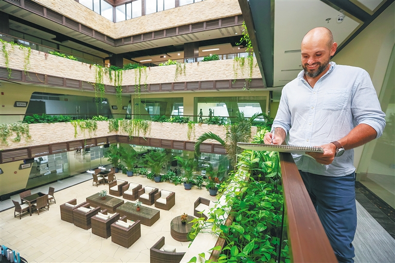 2019年8月16日,在海口市高新技术产业开发区的海南聚能科技创新研究院,乌克兰籍建筑设计师奥列克斯·尼科诺夫在研究设计方案。在海南工作的4年时间里,奥列克斯·尼科诺夫参与设计了澄迈千秋城市广场、海口高新区膜力创新工厂等项目,广受好评。