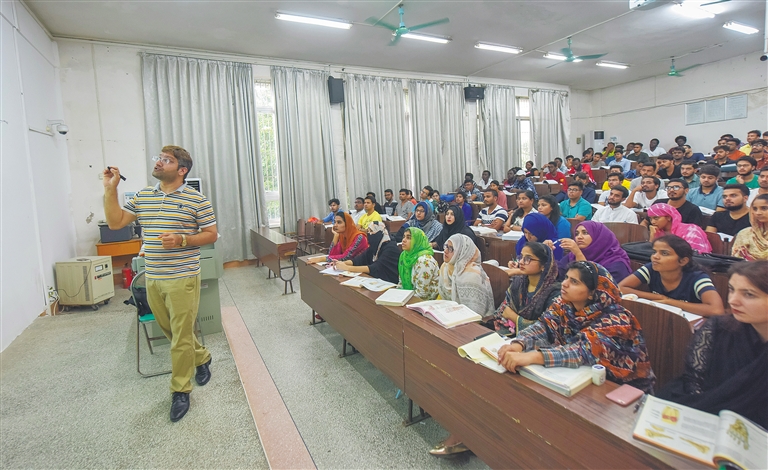 2019年8月26日,海南医学院,来自巴基斯坦的外籍老师吉米在给学生们上课。吉米10年前来到海南,两年前拿到了中华人民共和国外国人永久居留身份证,并成为一名“海南女婿”。2016年,海口市与巴基斯坦拉合尔市签署了结好文书。“很荣幸,当年这一结好,我也参与其中。很期待接下来自己能再一次充当‘纽带’,为双方更多领域的友好交流作出自己的贡献。”吉米说。