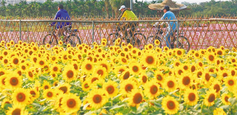 琼海龙寿洋田野公园,游客边骑行边欣赏美丽花海。记者 陈元才 摄