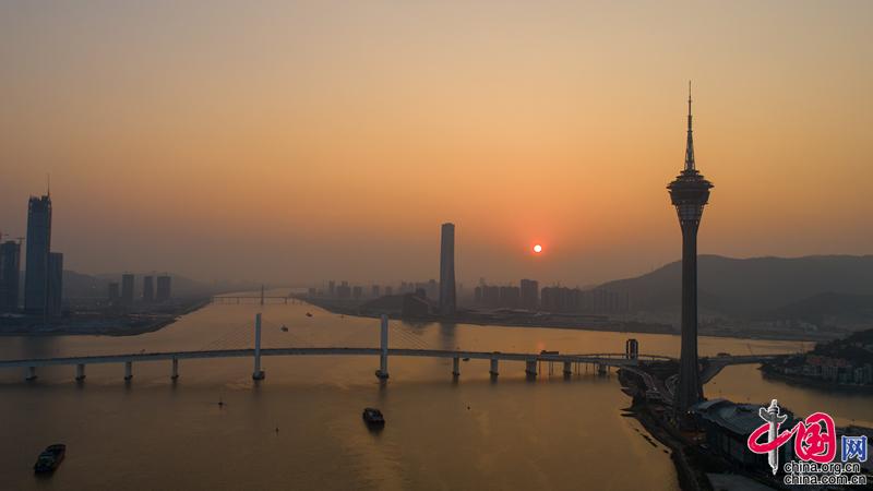 2019年12月3日,航拍澳门旅游塔和珠海日落。张金加 摄