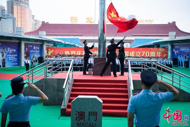 当日,在拱北口岸粤澳边界线上,国家移民管理局珠海边检总站与澳门特区政府治安警察局首次共同举行“同升国旗共唱国歌”活动,以一种别开生面的方式向祖国母亲70岁生日献礼。澳门警察乐队奏响国歌,双方警员整齐列队,面对国旗庄严敬礼,目视五星红旗冉冉升起,献上衷心祝福。