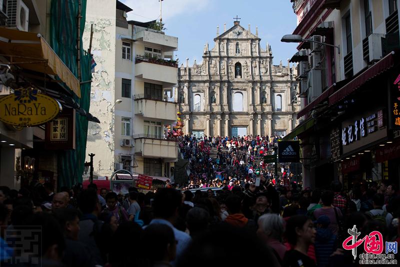 大三巴牌坊前,游客络绎不绝。张金加 摄