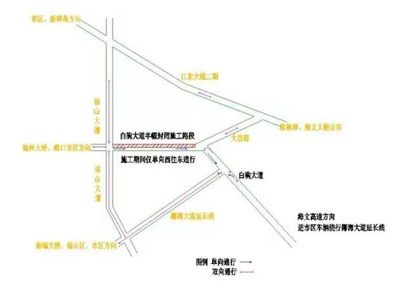 据悉,半幅封闭围挡施工计划分为两个阶段,2019年12月10日至2020年1月15日,封闭现状白驹大道北侧,南侧保持开放交通,由西往东单向通行;2020年1月15日起至2020年3月10日,封闭现状白驹大道南侧,北侧保持开放交通,由西往东单向通行。同时,半幅封闭围挡施工单向通行路段为白驹大道,起点为白驹大道与琼山大道交叉口,终点为白驹大道与椰海大道延长线交叉口。