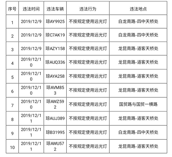 海口网12月22日消息(记者傅巍)22日,海口网(微信号:haikouwang2013)记者从海口公安交警支队获悉,车牌号琼AY9925等10辆小汽车,近期因存在不按规定使用远光灯违法行为,根据《海南省道路交通安全法》第90条、《海南省实施<道路交通安全法>办法》第64条第1款第22项的规定,交警部门将处以罚款200元处罚。