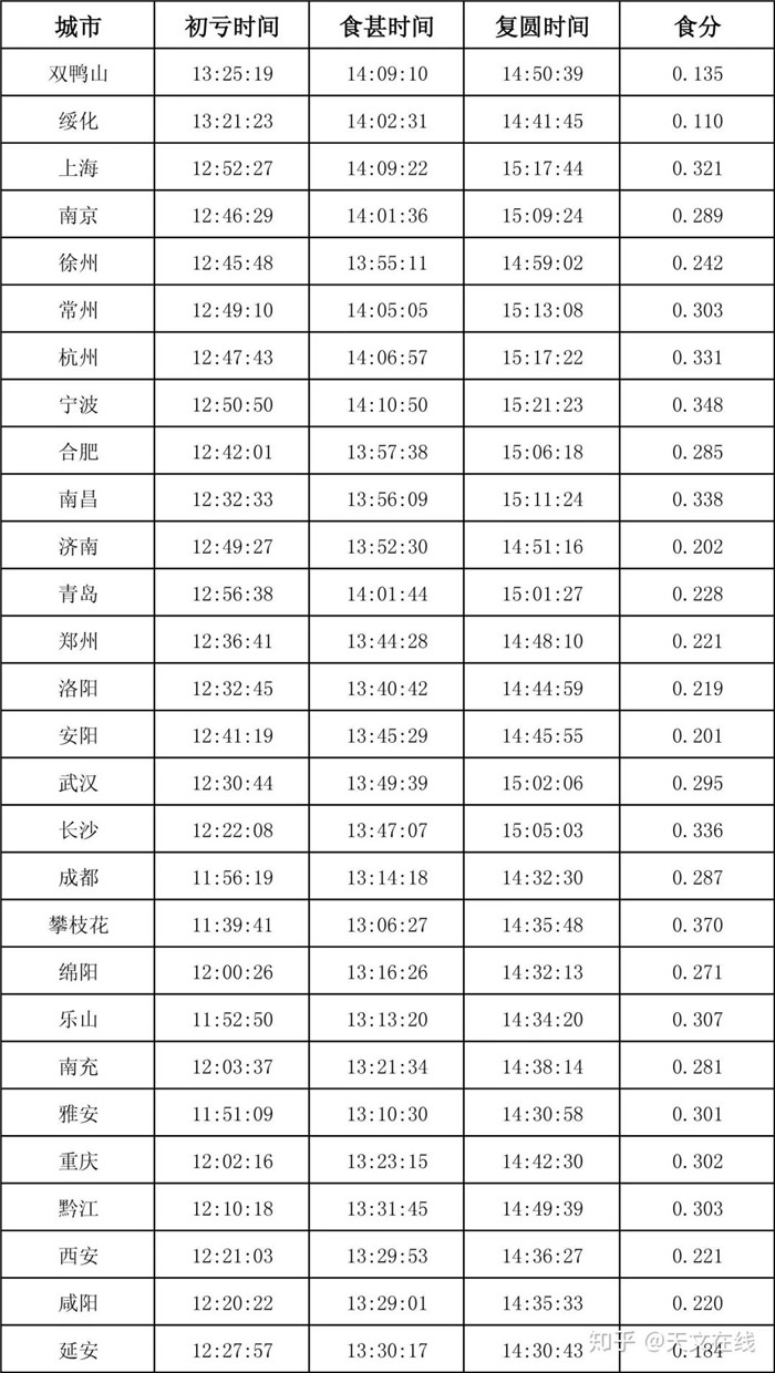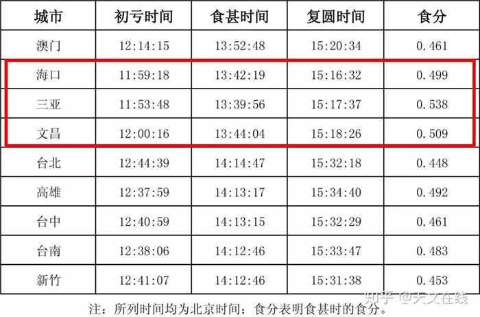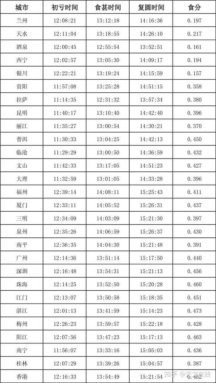 “10时56分左右月亮半影进入我国西藏阿里地区,而后月亮半影向东北上扫过中国全境,我国均可看到不同程度的日偏食,其中,海南食分最大,为0.499;漠河食分最小,为0.021。15时37分后月亮半影由海南省离开我国,对我国来说,可见日食时间历时4个多小时。”中国天文学会会员、天津市天文学会理事史志成说。