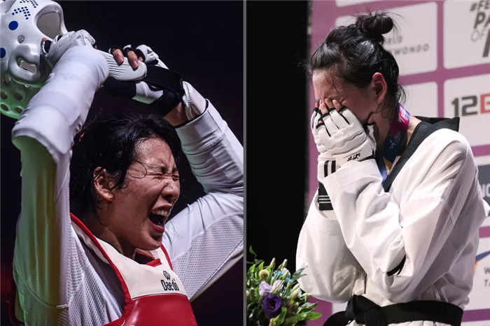 左图为12月7日,中国选手郑姝音在世界跆拳道大奖赛总决赛女子67公斤以上级决赛后庆祝夺冠。新华社发(叶夫根尼·西尼岑摄)