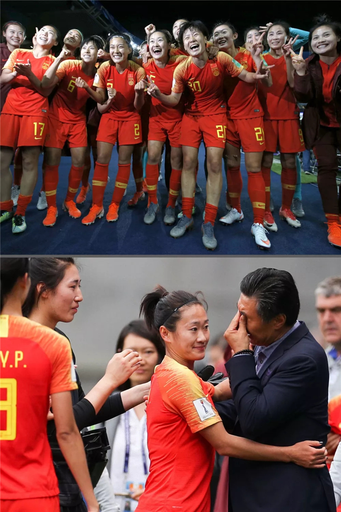 下图为6月17日,中国队球员吴海燕(右二)与激动落泪的主教练贾秀全(右一)在2019年国际足联女足世界杯与西班牙队的小组赛后拥抱。中国队与西班牙队携手出线。新华社记者郑焕松摄