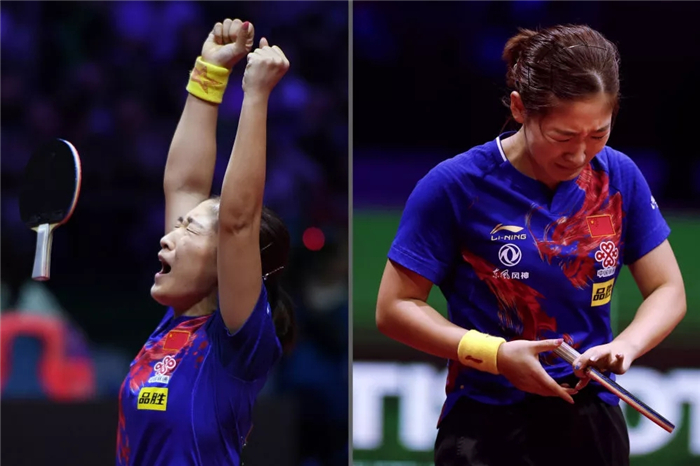 左图为4月27日,刘诗雯在夺冠后扔拍庆祝。新华社记者陶希夷摄