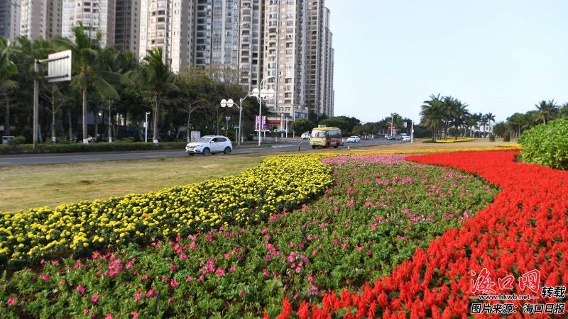 1月6日,海口滨江路一处斜坡绿地,色彩艳丽的一串红、何氏凤仙、万寿菊等鲜花连成一片,犹如一条“彩带”迎接新春。据介绍,滨江路共栽花草14万盆,总面积约6000多平方米,目前已竣工。石中华 摄