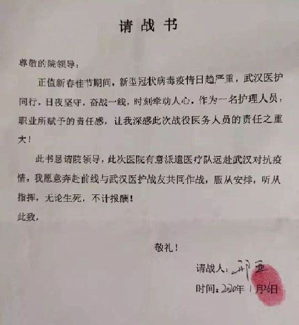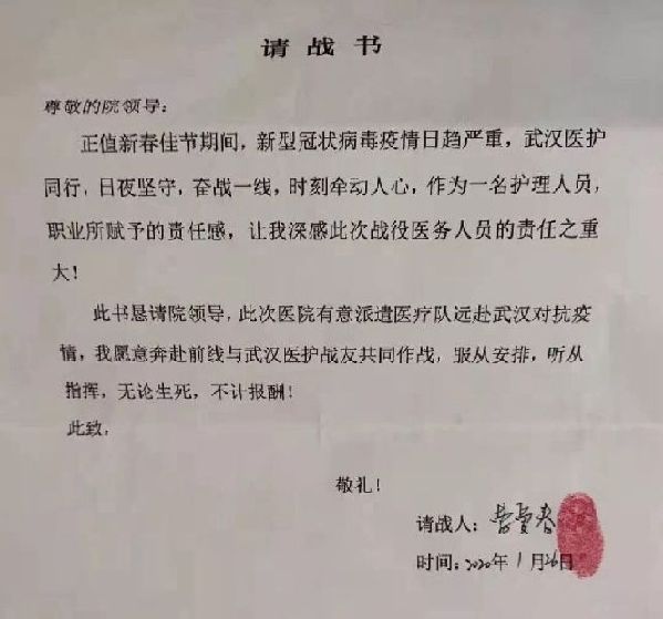 甘肃省定西市人民医院新生儿科护士长曹爱春和护士邢亚半夜写下请战书,恳请院方批准奔赴一线。落款时,两人写了八个字:无论生死,不计报酬。(定西市人民医院供图)