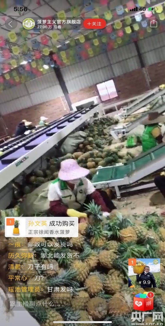 2月19日,徐闻菠萝成为拼多多联合央视发起的助农系列直播首个“主角”。用户通过助农专区进入直播间,可以一起观赏“菠萝的海”景观,并可参与9.9元五斤的万人团活动。