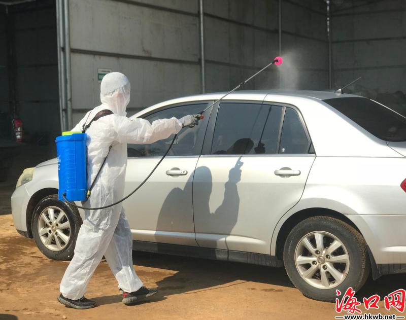 工作人员对外来车辆进行消毒。吴安宜 摄