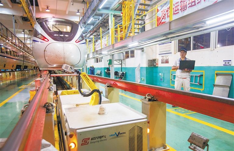 1月14日晚,在广州动车段三亚动车运用所检修库,工作人员正在调试车底智能检测机器人。记者 武威 摄