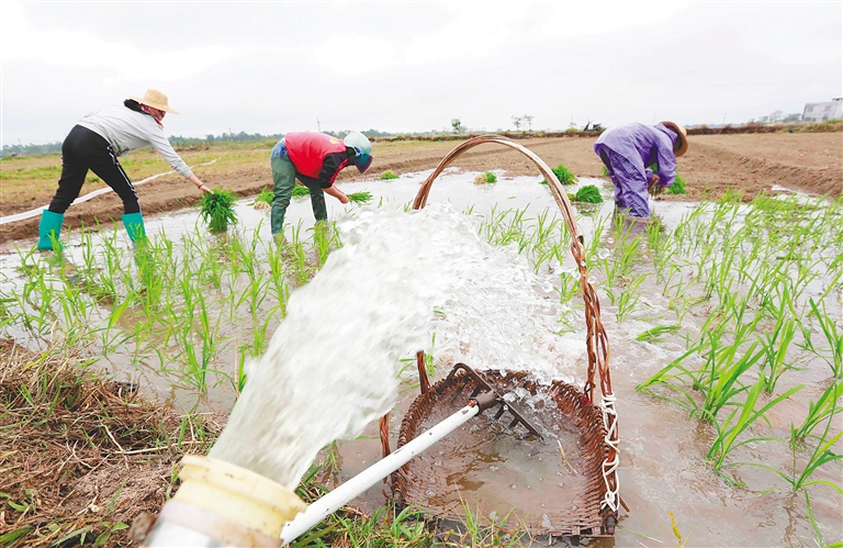 3月7日,在儋州市新州镇,农民忙着为缺水的稻田抽水灌溉,保障稻田能顺利插秧。时下,儋州市正多措并举保障复工复产,不误春耕农时。