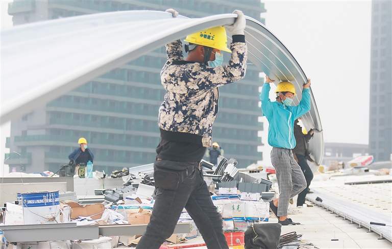 3月12日,在海南国际会展中心二期项目施工现场,工人正在搬运屋面建筑材料铝镁锰合金板。