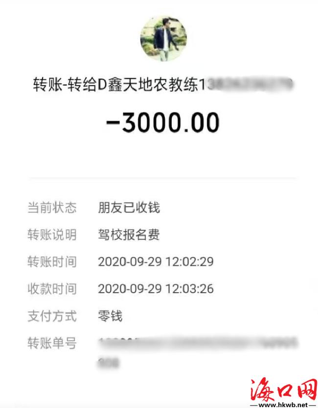 据林女士介绍,9月29日,她在位于琼山区滨江路的鑫天地驾校报名学车。当时报的是C1手动挡普通班,收费4800元。“当天白天我去看了驾校,晚上驾校的农教练便催我交定金,他说名额有限晚了就报不上了。”林女士称,29日晚上她便转账3000元定金给农教练,次日早上才去签合同。