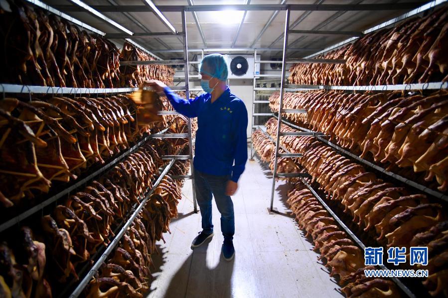 11月18日,沙县小吃产业园一家企业工作人员查看库房中的熏鸭。新华社记者 姜克红 摄