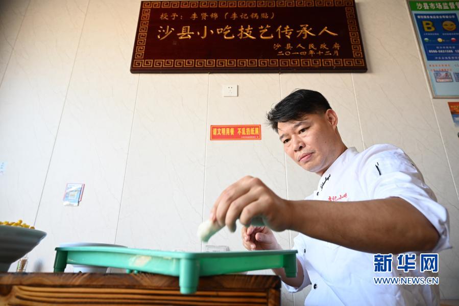 11月18日,在福建省三明市沙县文昌美食街,沙县小吃技艺传承人李贤锦在包锅贴。新华社记者 姜克红 摄