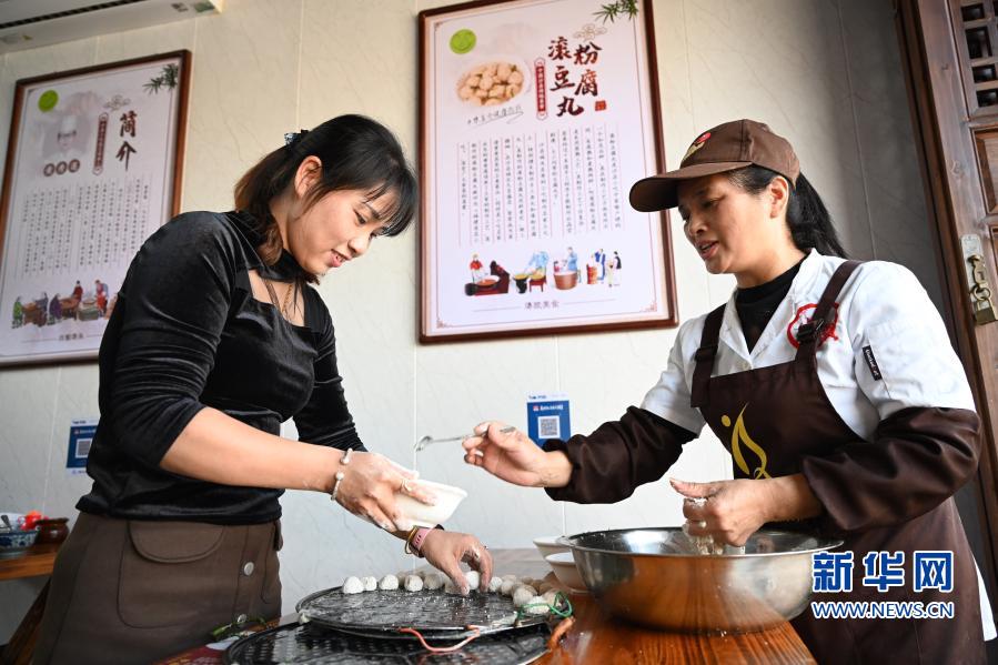 11月18日,在福建省三明市沙县文昌美食街,沙县小吃经营业者在制作滚粉豆腐丸。