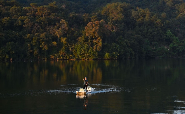 11月20日,常口村村民在村旁的金溪上划船。新华社记者 宋为伟 摄