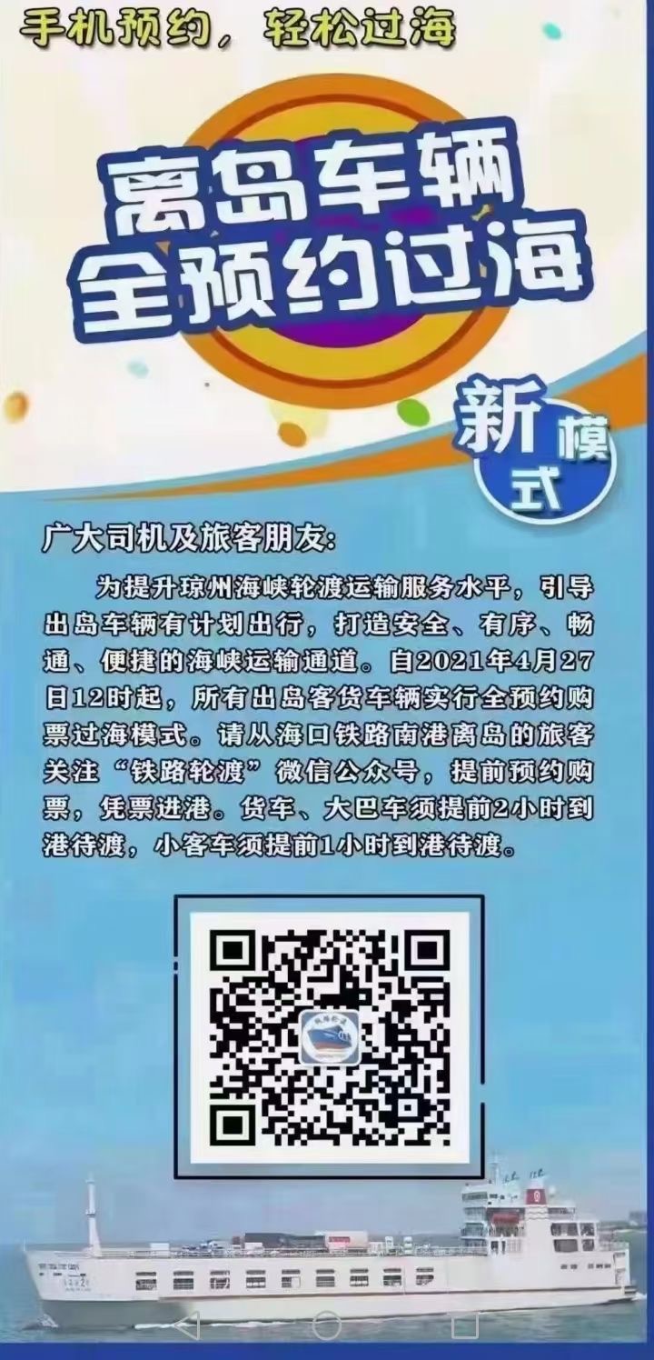 三、预约错峰出行。第一时间掌握铁路轮渡、列车运行动态,铁路部门将通过微信公众服务号“铁路12306”,“铁路轮渡”微信公众号、12306网站、12306客户端等多种形式及时发布客车正晚点、余票等信息,大家及时了解车票信息,妥善安排出行和接送站时间。特别汽车自驾游旅客在离岛时注意,4月27日12时起,所有出岛客货车辆,须提前预约购票,未在网上预约购票车辆不能进港待渡。如遇不良天气等非正常情况,旅客可提前通过以上方式查询轮渡、列车运行情况,合理安排行程。