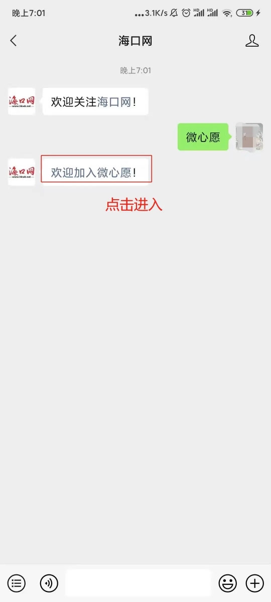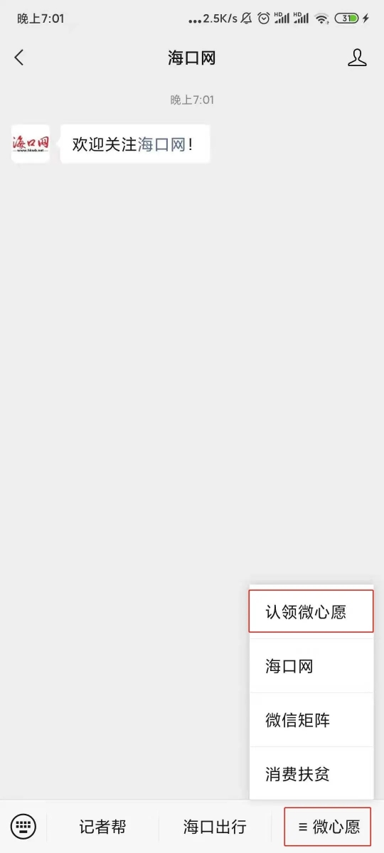 关注海口网微信公众号,私信发送“微心愿”或点击右下角【微心愿】菜单