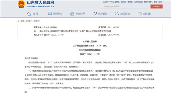 7月9日,山东省人民政府发布关于烟台招远曹家洼金矿“2·17”较大火灾事故调查报告的批复。