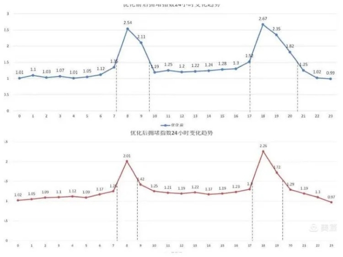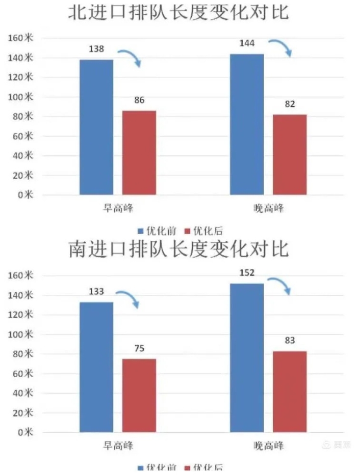 优化后通行量高峰出城增加328辆,提升18%;进城增加350辆,提升21%。