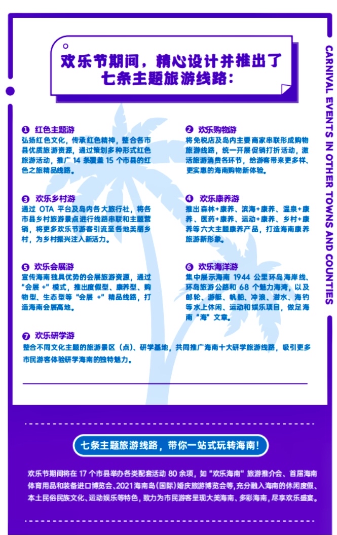 据了解,开幕式及主要活动版块分别由2021年(第二十二届)海南国际旅游岛欢乐节开幕式及椰岛欢乐嘉年华活动,“欢乐海南”旅游推介会,2021年(第六届)海南世界休闲旅游博览会、2021年(第七届)海南国际旅游美食博览会、2021年(第二届)海南国际旅游装备博览会及“三展”开馆仪式,2021年海南省艺术节——海南省优秀文艺作品展演展示活动,2021年(第二十二届)海南国际旅游岛欢乐节闭幕式等5项活动组成。