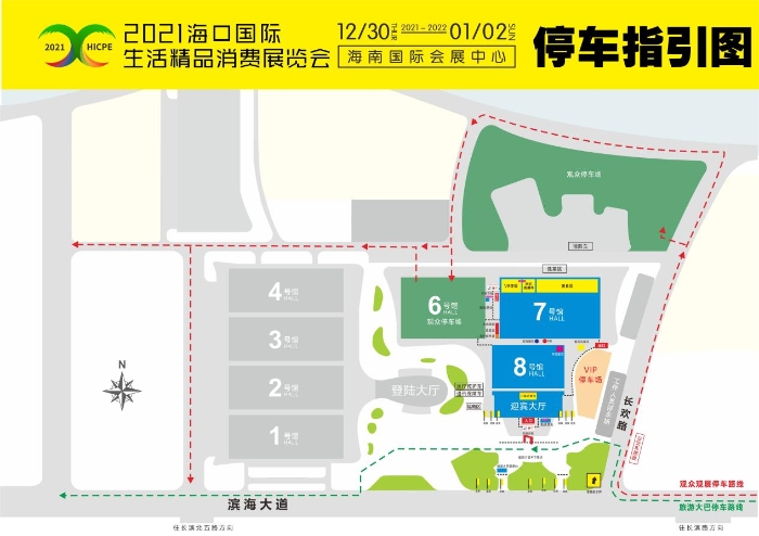 导航“海南国际会展中心”,沿滨海大道方向行驶右转进入长欢路,沿途共设置有3个露天停车场及会展中心6号馆室内停车场,共计4个停车场为观众免费泊车。