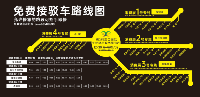 展会期间,主办方为市民游客提供了免费接驳车服务。每日7:30开始发车,四条专线覆盖海口市区和澄迈老城,往返海南国际会展中心,分别为:1号专线海甸岛线、2号专线国兴大润发线、3号专线椰海大道线、4号专线澄迈老城线。