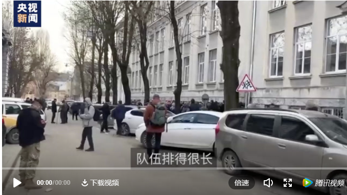 当地时间25日中午,中央广播电视总台CGTN报道员在乌克兰西部城市利沃夫的街头听到长鸣的警报声,警报提示大家避难。在利沃夫的征兵处总部,数百人排成长队聚集在征兵处等候报名入伍。
