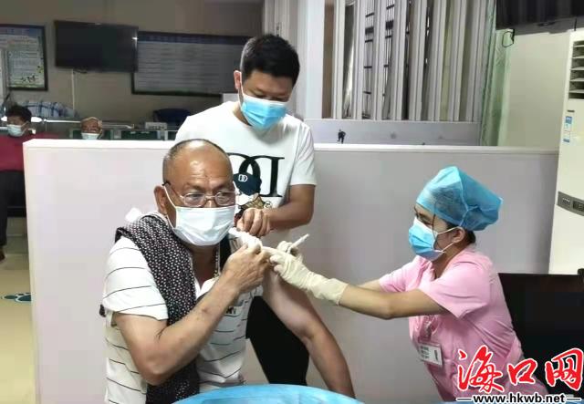 陈开枫(左二)动员60岁以上老人接种疫苗。(美兰区供图)