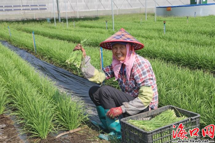 “来,大家看下,这是我们刚刚收割的新鲜韭菜,口感清甜,富含各类维生素。顺便和大家分享一种新奇的吃法,就是蘸芥末直接生吃……”4月28日上午,在海口秀英区一片韭菜田中,3位农户拿着镰刀,在“嚯嚯”忙着收割韭菜。边上进行网络直播的村民蒋雯聿还现场演示了生吃韭菜。“这些韭菜不打农药,不施化肥,百分之百有机肥种植,特别好吃,请大家放心食用!”这些韭菜正是产自乡村振兴东山村集体经济试验示范基地。