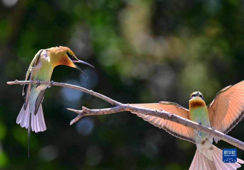 5月3日,两只栗喉蜂虎在枝头上鸣叫。