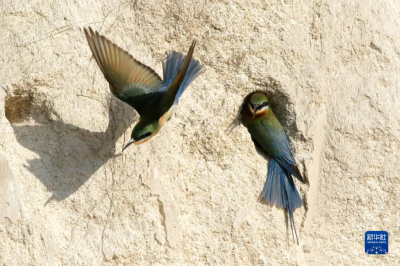 5月3日,两只栗喉蜂虎在土墙边筑巢。
