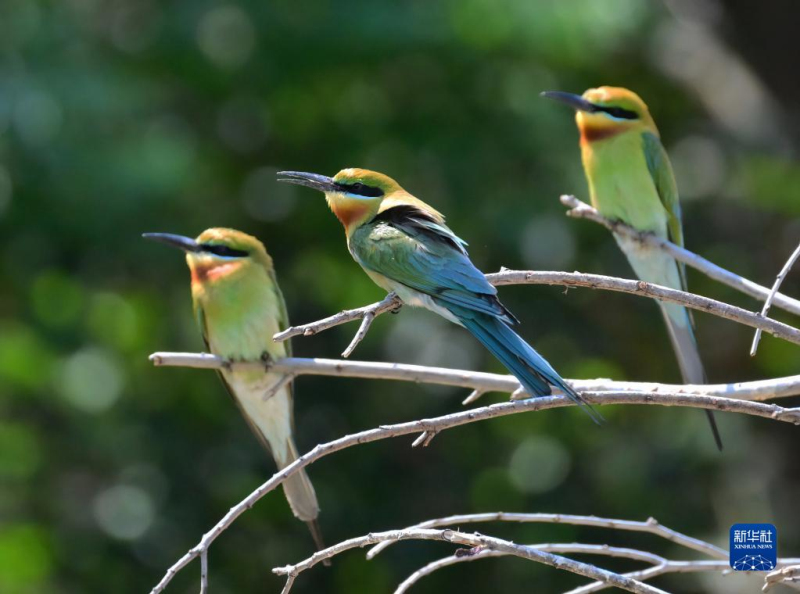 5月3日,三只栗喉蜂虎停留在枝头。