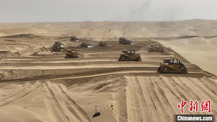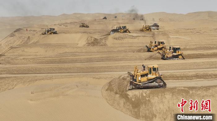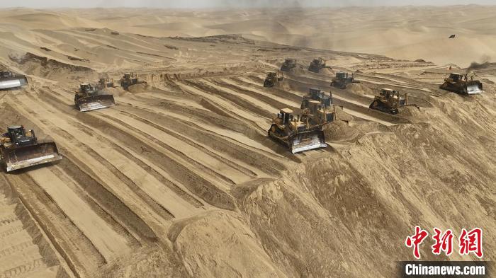 大型推土机并排在黄沙中平整高大沙丘,场面震撼。 赵志伟 摄