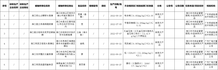 海口网9月23日消息(记者史子杨)近期,海口市市场监督管理局组织抽检食用农产品、糕点共241批次,其中不合格样品6批次。发现的问题主要包括农兽药残留超标、重金属污染、质量指标不达标等。