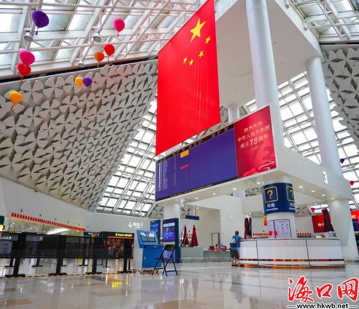 机场挂上国旗,国庆氛围浓厚。(美兰机场供图)