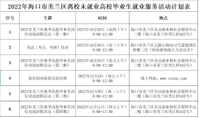 海口网10月18日消息(记者陈捷)海口市美兰区人力资源和社会保障局将于10月至11月期间举办六场公共就业服务活动,包括在10月20日、10月28日、11月9日、11月11日举办四场专场招聘会以及在10月26日、11月4日举办两场专项培训。