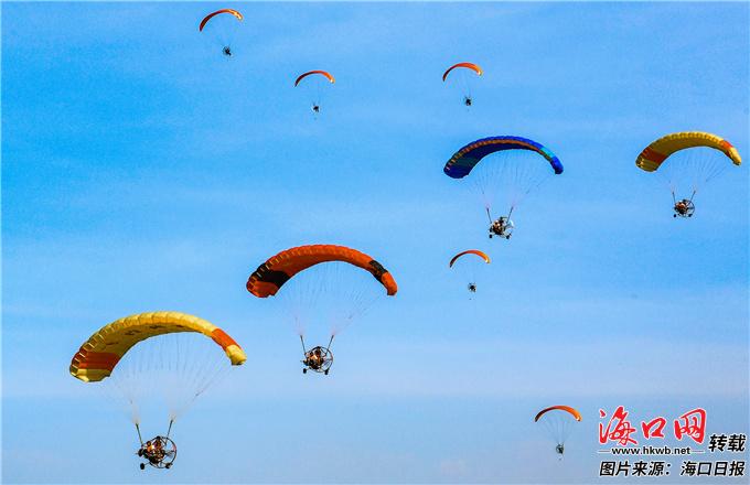环海南岛飞行大赛·海口站动力伞魅力海岸锦标赛在海口西海岸举行,参赛选手在进行赛前飞行表演。 海口日报记者 康登淋 摄