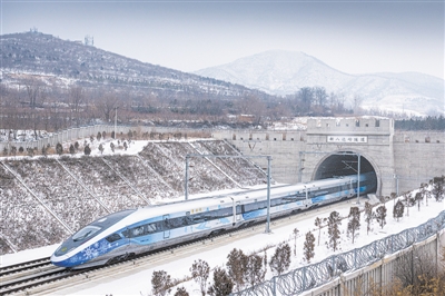 2022年1月22日,采用“瑞雪迎春”涂装的北京冬奥智能动车组飞驰在京张高铁上。视觉中国供图