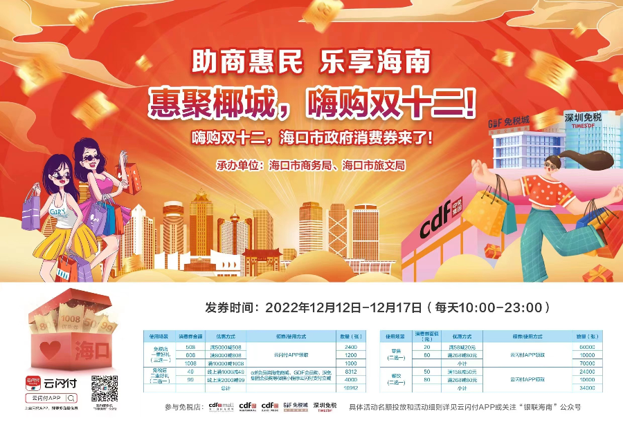 记者从海口市商务局获悉,2022年12月12日10:00—12月17日23:00,海口将举办“惠聚椰城,嗨购双十二!”主题活动,通过云闪付APP发放新一轮政府消费券。本轮消费券同样分为免税消费券以及零售、餐饮类消费券,总计投放金额达800万元。